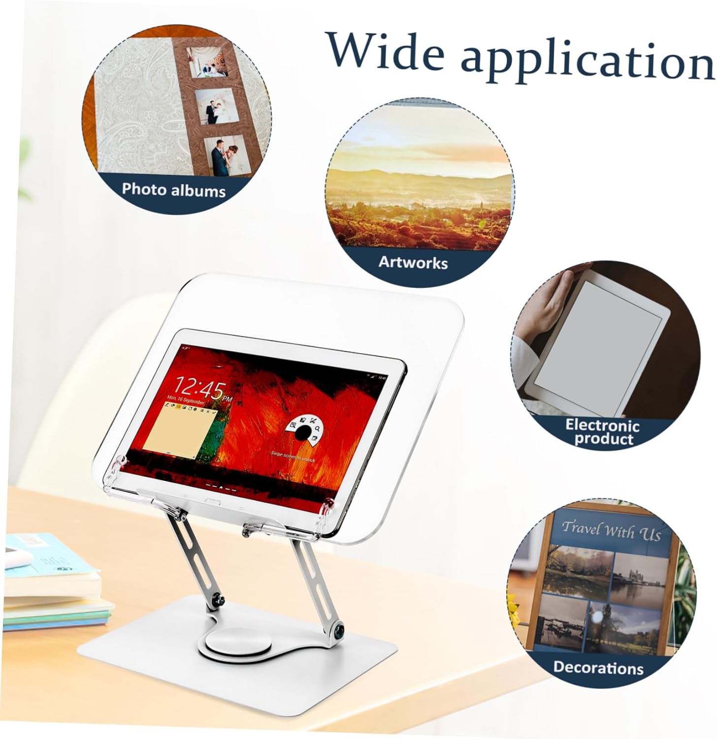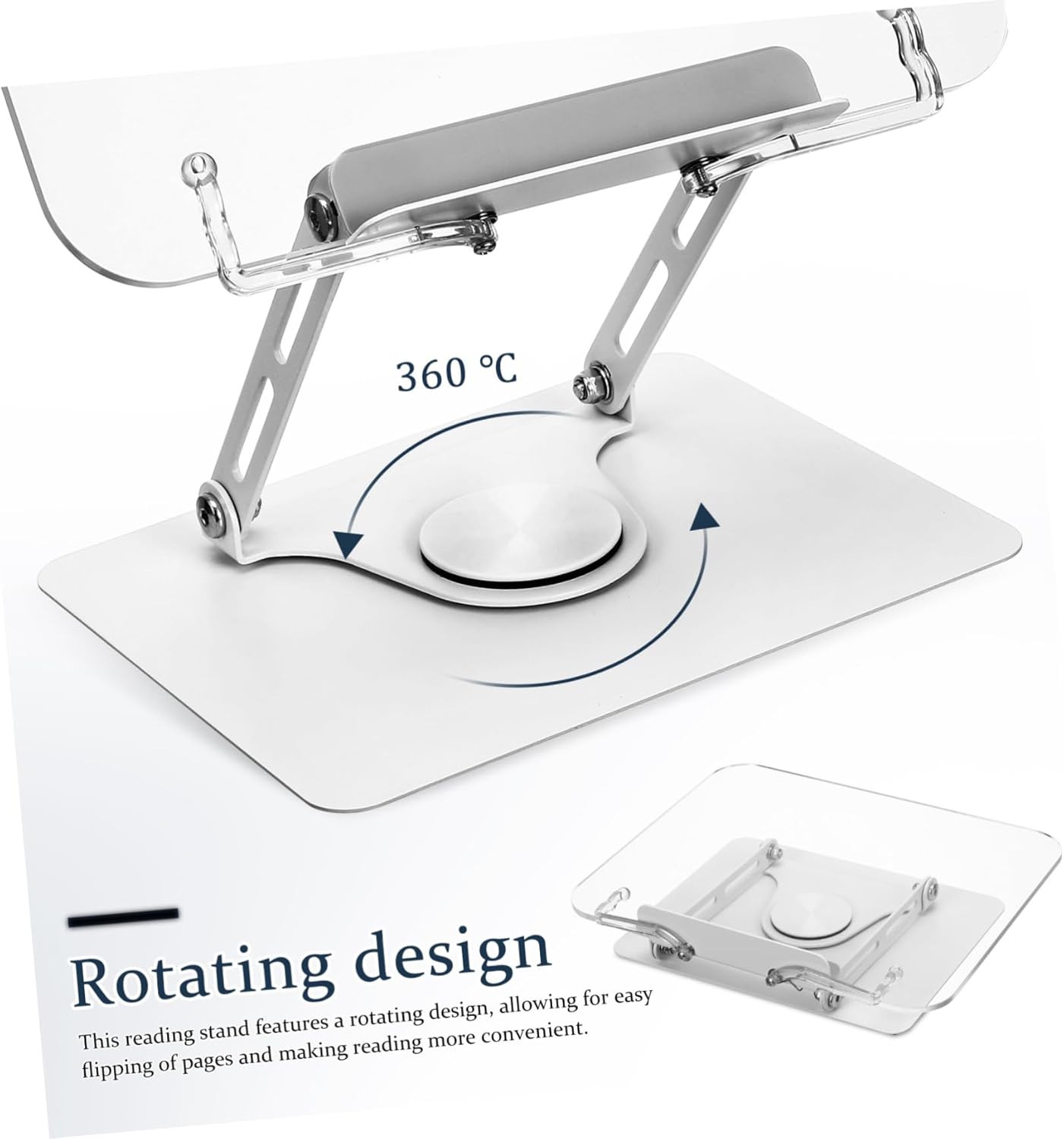 Package List 1 x reading stand Features -Color:Transparent textbook holder -Height adjustment: Effortless height adjustment accommodates different readers, fostering a healthy spinal alignment and reducing neck tension during reading Book Holder Stand. -Enhanced stability: A well-balanced and sturdy base keeps the reading stand firmly in place, providing a reliable platform for your reading materials adjustable book stand. -Height range: 4.4-39cm tablet holder -Wide application: The transparent book holder is suitable for home, office, library, and other settings, catering to the reading needs of different individuals reading stand book holder. -Rotating design: This reading stand features a rotating design, allowing for easy flipping of pages and making reading more convenient book reading stand. -Size:30.00X24.00X1.00cm/11.79X9.43X0.39in laptop base -Material:Acrylic, metal book stand for reading -Page clip: The integrated page clips securely maintain pages open, avoiding unintended page turns and augmenting concentration and ease of use reading stand for desk.Goods Informationlaptop stand for desk Enjoy ergonomic reading with our transparent, rotating book stand.laptop riser Crafted with a base for stability, this stand also comes equipped with handy page clips, making it the ideal partner for hands- reading.laptop stand Adjust its height effortlessly to match your comfort needs, and enjoy the 360-degree rotation for seamless page turning without strain